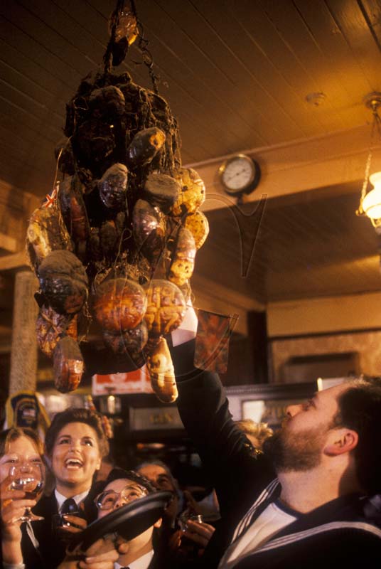 A new ‘Widow’s Bun’ being hung by a serving sailor on Good Friday 1987 in The Widow’s Son pub in Bromley-by-Bow, East End, London, to await the return of the missing sailor
