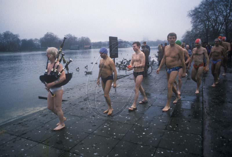 Contestants for the Christmas Day Race for the Peter Pan Cup in the Serpentine, Hyde Park, London, 1983 (The piper, Mario McClarnon, won the cup - on other days he was to be found busking near Oxford Circus)