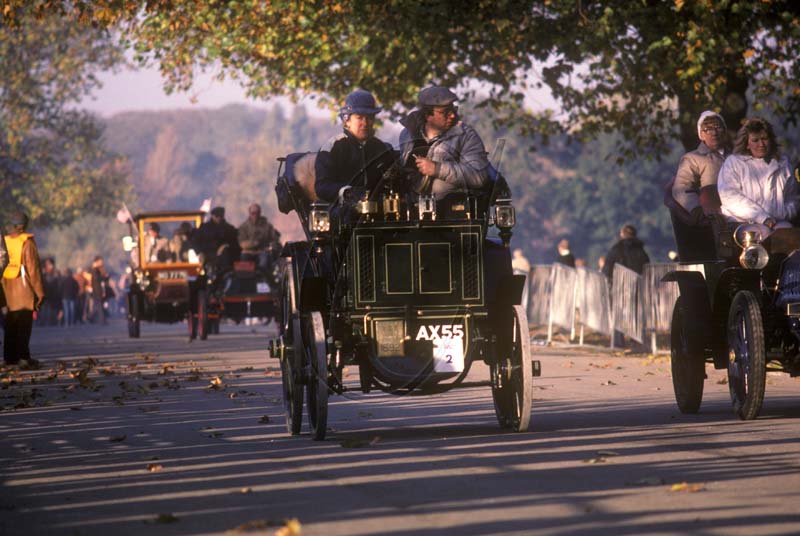 At the start of the London to Brighton Veteran Car Run in Hyde Park, London, England, 1985