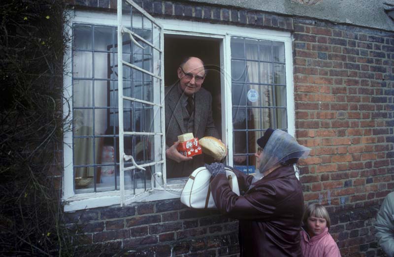 Distribution of the Chulkhurst Charity (also known as the Biddenden Dole) consisting of bread, cheese and tea, at the Old Workhouse, Biddenden, Kent, in 1983