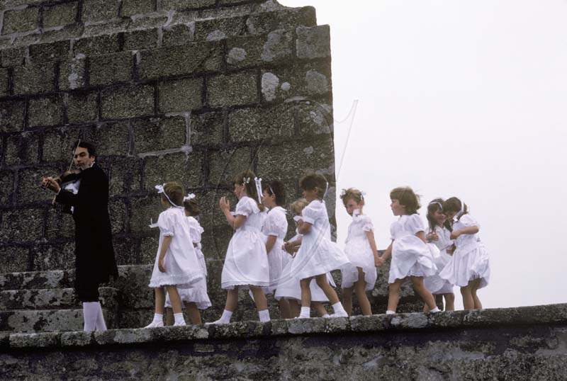 The Fiddler leads his ‘ten little girls’ in a dance around Knill’s Steeple according to the terms of the will of John Knill, St Ives, Cornwall, 1986