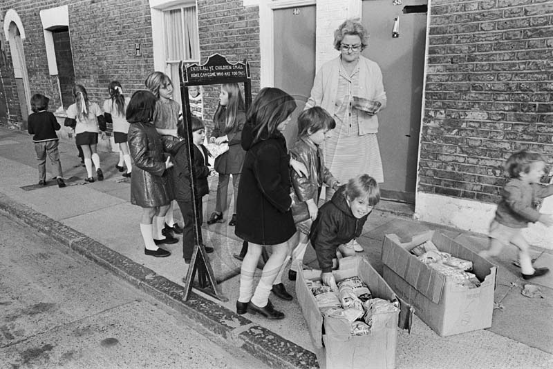 Farthing Bundles for children who could walk beneath the arch at Fern Street Settlement, Bromley-by-Bow, East London, 1972 (The Settlement still thrives, in a smart new building, but there is no demand for the bundles)