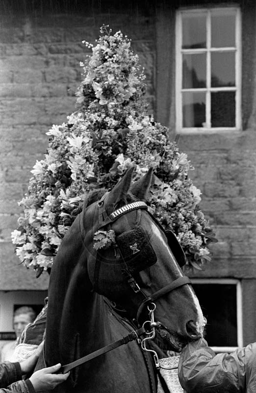 The King on his steed on Garland Day, Castleton, Derbyshire, England, 1973