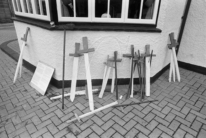 Swords outside the pub while the Mummers take on fuel. Local tradition demands they are all broken by the end of Boxing Day, Crookham Village, Hampshire, England, 1992