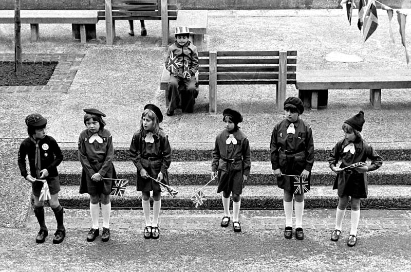 Guess who is coming to visit; brownies, a cub and an ardent royalist await the Queen’s Jubilee visit to the Pepys Estate, Deptford, London, on 9 June 1977