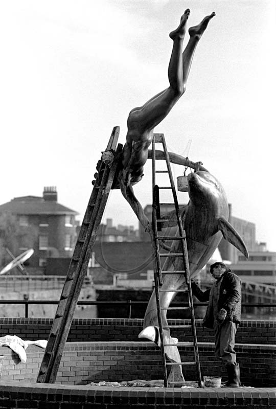 Polishing time for ‘Girl with a Dolphin’, the bronze sculpture by David Wynne (1973) which stands near the north end of Tower Bridge, London, 1981