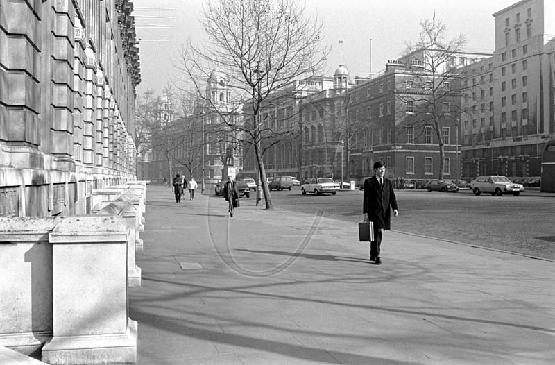 Civil servants on their way to work in Whitehall, London, one morning in April 1982