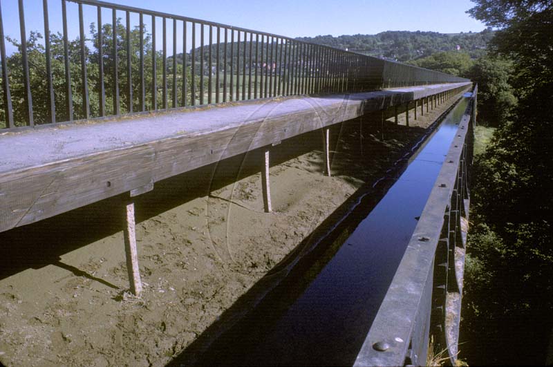 Pontcysyllte Aqueduct, four miles east of Llangollen in North Wales, drained for routine maintenance in 1975 and showing the cantilevered tow path on the left. The aqueduct was the astonishing achievement of Thomas Telford in 1805