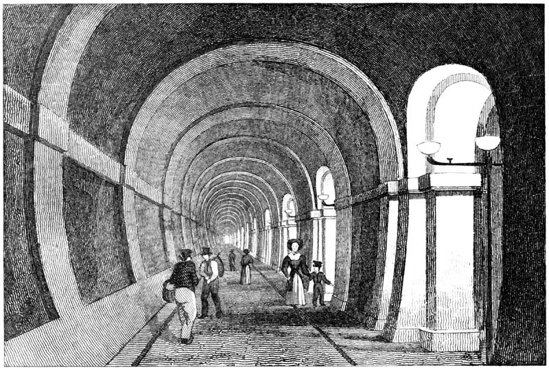 The Thames Tunnel between Wapping and Rotherhithe as it appeared when originally opened for traffic in 1843 after 18 years of toil by Marc and Isambard Brunel. Never a success as a roadway it has worked well as a rail tunnel since 1869