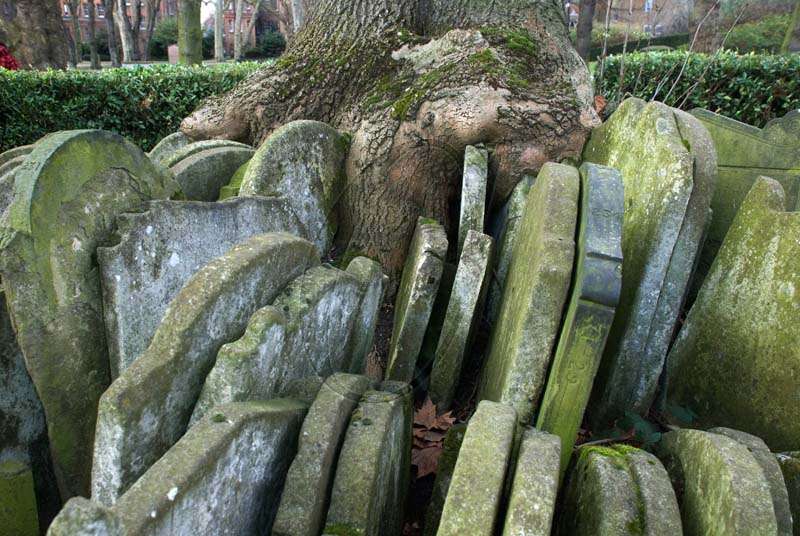 ‘The Hardy Tree’ in Old St Pancras churchyard, north of St Pancras Station, London (When the Railway was being built the young Thomas Hardy was charged with moving the graves and preserving the headstones in this dense cluster - the ash tree grew later).