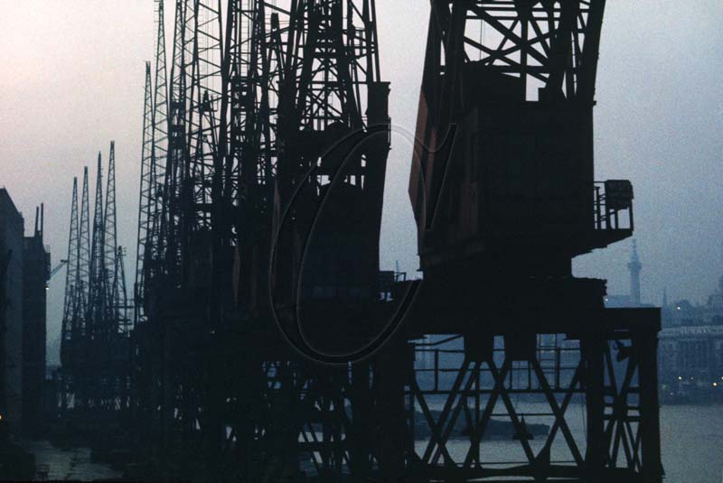 Cranes on the south bank of the Pool of London in 1960 (Near where the new City Hall and HMS Belfast are now; the Monument to the Great Fire is in the distance on the right)