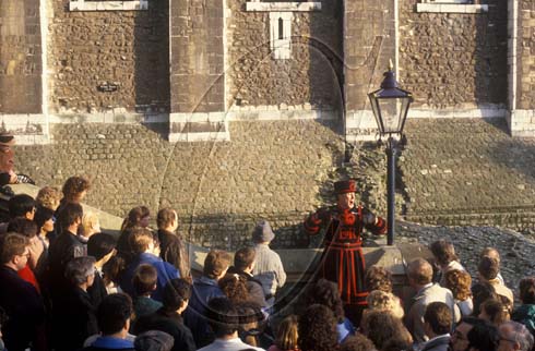 A Yeoman Warder with a group of tourists at the Tower of London, late 1980s