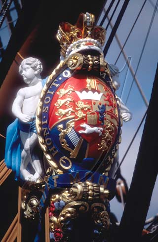 Coat of Arms on the bow of Nelson’s warship HMS Victory launched 1778 now at Portsmouth Hampshire England UK
