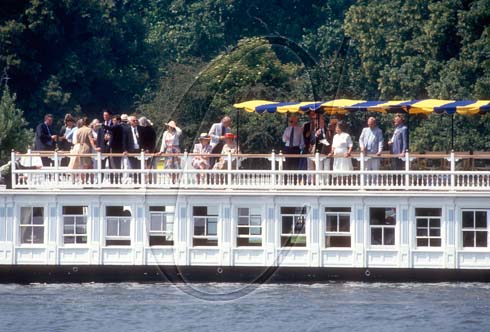 People on a college barge at Henley Royal Regatta on the River Thames in Oxfordshire England UK