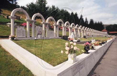 Graves of 116 children of Aberfan, Merthyr Tydfil, killed when a slag heap collapsed on their school in 1966