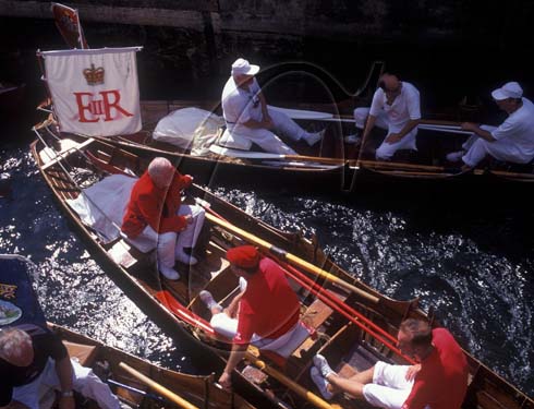 Having a breather in Boveney Lock during Swan Upping on the River Thames, Berkshire, England