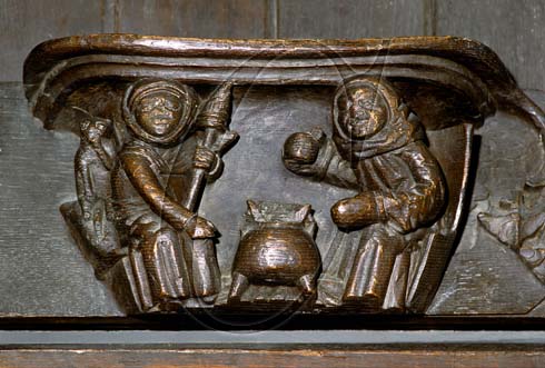 Rural year misericord in St Mary, Ripple, Worcestershire - December, spinning