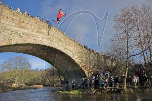 New Years Day bridge jump into River Dove from Okeover Bridge, Mappleton, near Ashbourne, Peak District, Derbyshire, England. (This charity event has been going since 1987)