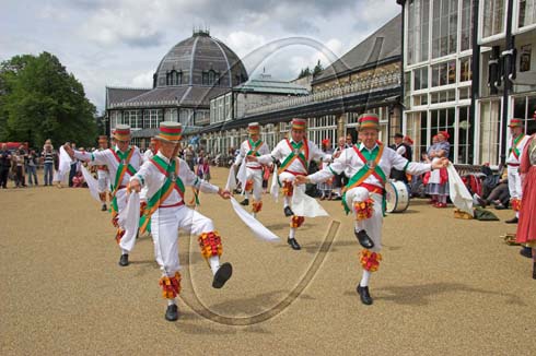 Morris dancers (the Adlington Morris Men) at Buxton Pavilion, Buxton, Peak District, Derbyshire, England