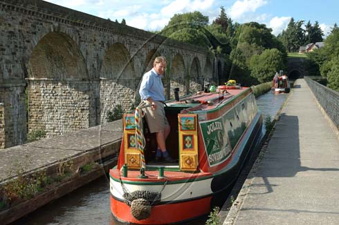 Narrow boat;Chirk Aqueduct; Llangollen Canal; Chirk Railway viaduct; Chirk; Clwyd;Wales;