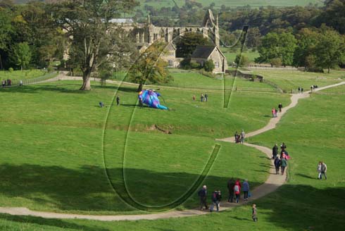 Bolton Priory from the village with kite about to fly Bolton Abbey North Yorks