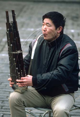 A busker playing a sheng, a type of Chinese mouth-blown organ made from bamboo, in Chinatown, London