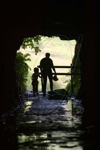 man and child explore old mine tunnels in Little Langdale, Lake district