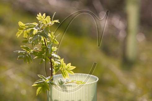 protective tube around young mountain ash tree, planted at Geltsdale, North Pennines