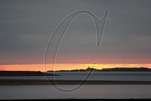 Sunset and rain clouds over Anglesey, viewed from the Caernarfon side of the Menai Straits, Snowdonia, Wales