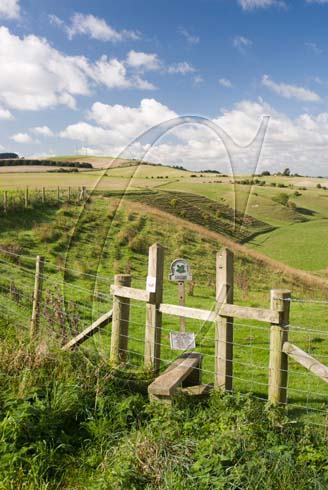 Stile above Calstone Coombes, Wiltshire, looking towards the twin masts on Morgan’s Hill.