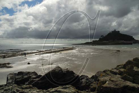 Sunshine and clouds over St Michael’s Mount, Cornwall, showing the causeway at low tide.