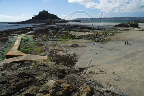 St Michael’s Mount, Cornwall, showing people crossing the causeway at low tide.