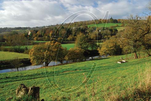 The Limpley Stoke valley, West Wiltshire, looking across the river Avon towards Monkton Combe, in North-east Somerset. Beyond the river is the Bath-Bradford-on-Avon railway.