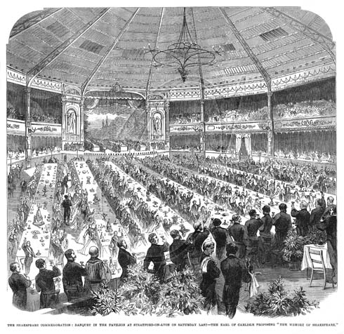 ‘The Shakespeare Commemoration’ Banquet in the Pavilion at Stratford-on-Avon, the Earl of Carlisle proposing ‘The Memory of Shakespeare’ ‘ - it was the tercentenary of his birth in 1564 (Illustrated London News, 1864)