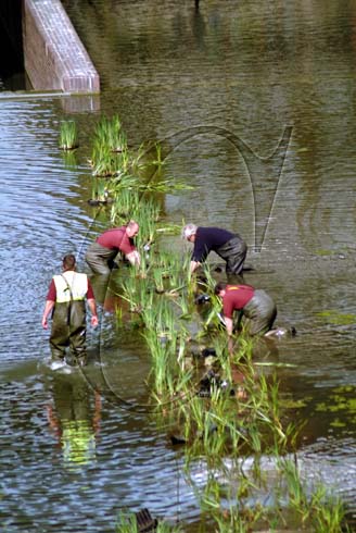 City of London: Barbican Estate. Contractors planting reeds in the Barbican Lake to assist in conserving wild lifeon the Barbican Lake