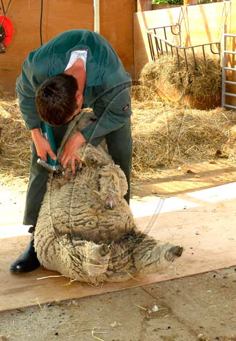 England: East London. Spitalfields City Farm, Tower Hamlets. ‘Dylan’ a one yr old ram is sheared by Tom Davies. Dylan is a Southdown sheep.