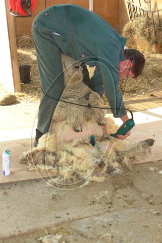 England: East London. Spitalfields City Farm, Tower Hamlets. ‘Dylan’ a one yr old ram is sheared by Tom Davies. Dylan is a Southdown sheep.