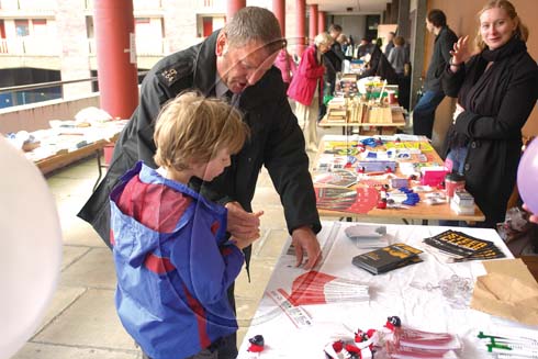 A bric-a-brac sale of clothes, cakes, etc, in the Golden Lane Housing Estate, London EC1, organised by the Residents Association. The City of London Police stall, where children could be fingerprinted.