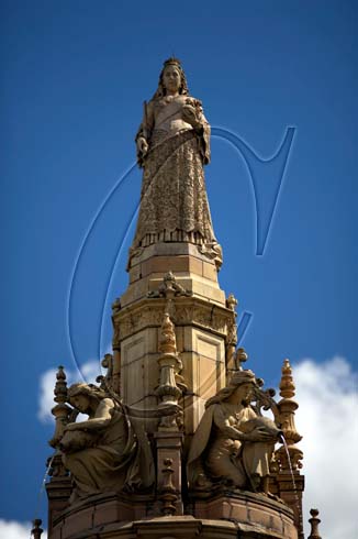 Top figure of Queen Victoria on the Doulton Fountain, Glasgow, Strathclyde, Scotland. Yellow terracotta in Francois I style designed by A. E. Pearce of Doulton and Co for the Glasgow Exhibition of 1888. Figure is flanked by angels pouring water.