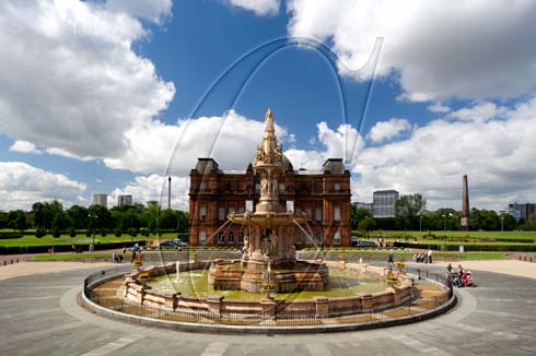 Doulton Fountain, Glasgow, Strathclyde. Yellow terracotta in Francois I style by A. E. Pearce of Doulton and Co for the Glasgow Exhibition of 1888. Water flows from lion masks into the two basins below. Peoples Palace behind the fountain. View from West.