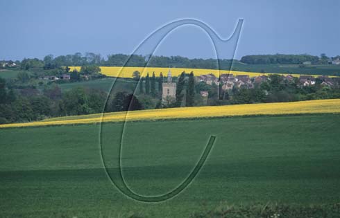 Medieval village of Boxford in the Box valley. Tower of St. Mary’s church protrudes above rape fields. West Suffolk.