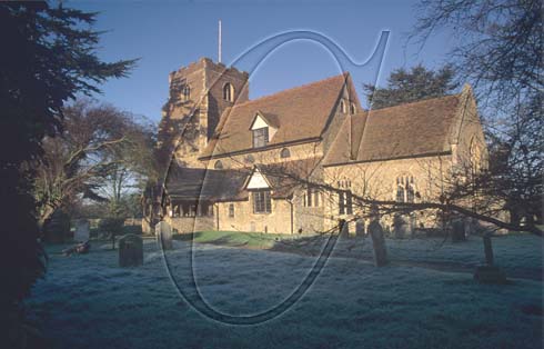 St Peter’s church. 12th century chuch with fine square Norman Tower and unusual dormer window. frosty winter churchyard
