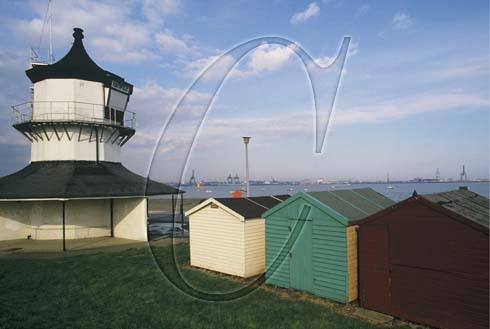 Beach huts and lighthouse with view to Felixstowe docks. Ships approaching Harwich would line up the low light on the shore with the taller light inland to navigate safely up the Orwell estuary to Harwich port.