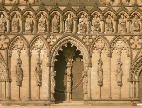 Details of the many stone figures on the Front of The red sandstone of Lichfield Cathedral. Staffordshire