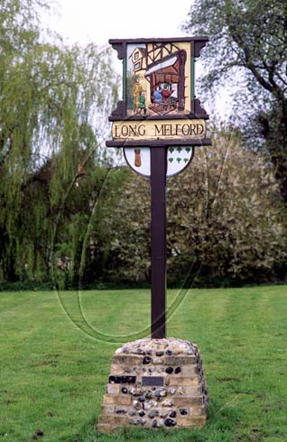 Village sign, Long Melford. On the small green at the north end of the long high street. Suffolk