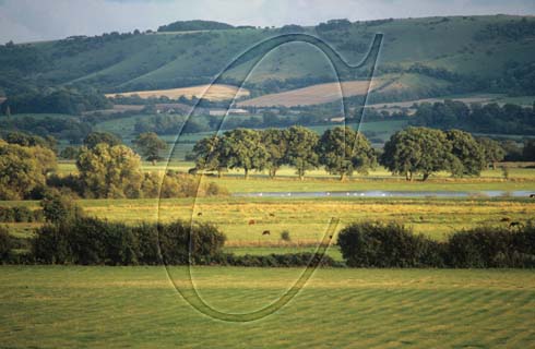 Looking East across Amberley Wild Brooks towards Rackman Hill, part of The South Downs of sussex, southern England