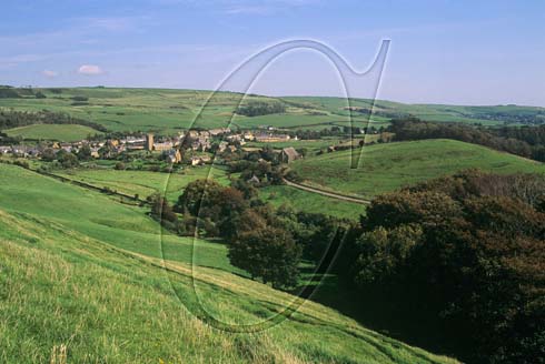 Abbotsbury village with parish church and tythe barn surrounded by lush green hills Dorset England