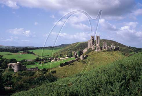 The ruins of Corfe Castle date from the times of William The Conquerer. The Purbeck hills stretch away to the West. Dorset ENGLAND