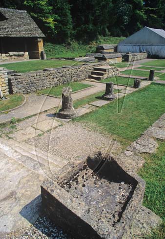 Chedworth Roman Villa. remains of pillars, paved paths and stonework