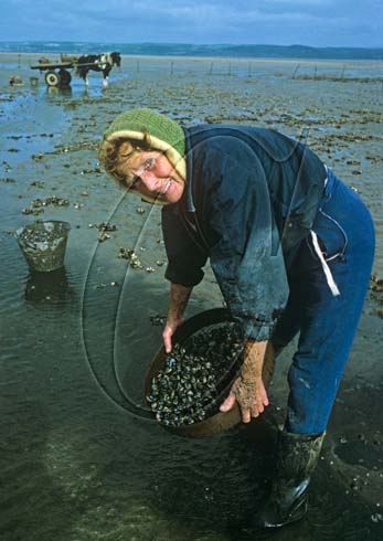 Woman picking cockles on the wide mudflats of The Gower Peninsula West Glamorgan Wales